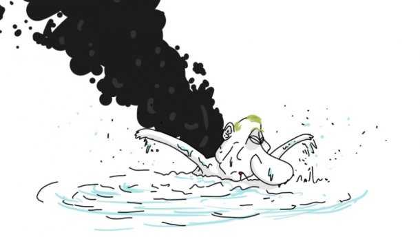 В частности, карикатурист изобразил вместо крейсера Президента России Владимира Путина, из спины которого идет густой столб дыма.