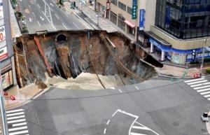 В центре японского города Фукуока под землю провалилась проезжая часть. Тысячи людей стали очевидцами ЧП.