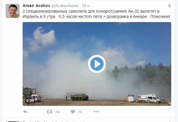 Министр МВД Украины Арсен Аваков сообщил, что приказом президента Петра Порошенко на борьбу с огнем в Израиль Киев отправит два специализированных самолета. Ожидается, что они вылетят сегодня в 09:00. К 16:00 техника должна быть на месте.