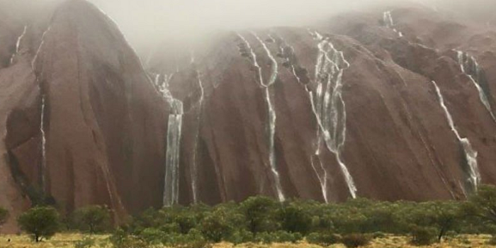 Скала Улуру является одной из самых известных природных достопримечательностей Австралии. В связи с небывалым рождественским ливнем, она превратилась в настоящий живительный водопад.