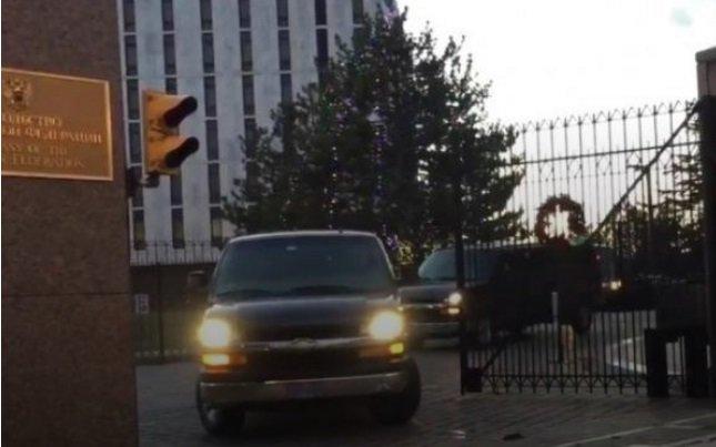 После внедрения новых санкций в отношении российских дипломатов, работающих в США, с территории посольства в неизвестном направлении выехали несколько фургонов черного цвета с отсутствующими номерными знаками.