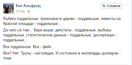 "Рыбаки поддельные, прихожане в церкви – поддельные, невесты на Красной площади – поддельные... Да чего уж там... Бери выше: депутаты – поддельные, выборы поддельные, статистические данные – поддельные, диссертации – поддельные... Все поддельное. Все – фейк", - заявил бывший чиновник России.