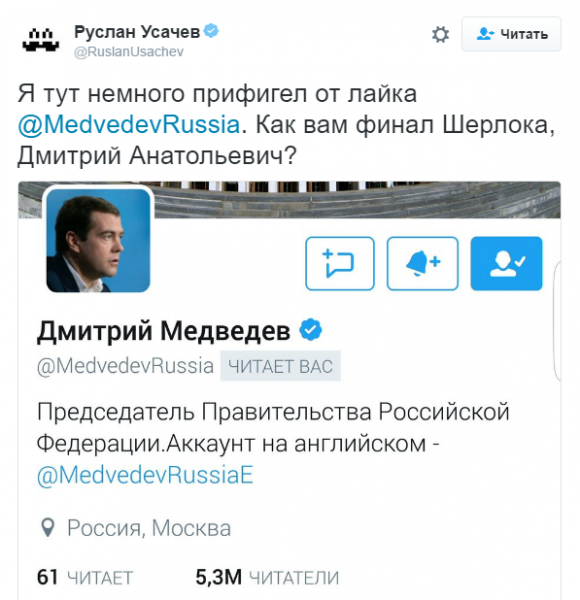 Официальный аккаунт премьер-министра России Дмитрия Медведева в Twitter поставил лайк посту видеоблогера Руслана Усачева, посвященному британскому телесериалу «Шерлок». Это единственный твит, отмеченный главой российского правительства в соцсети.