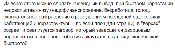 Сотник сообщил, что в случае быстрого нарастания недовольства жителей России массовой безработицей, голодом и предложением грабежей русских политическая элита России придет к пониманию реализации заговора, который приведет к дворцовому перевороту и турбулентности в российской власти.