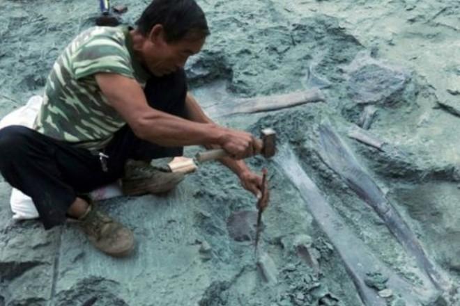 Останки принадлежат диноцефалозавру - это пресмыкающиеся, которые жили на территории нынешнего Китая. В останках взрослого животного были найдены останки детеныша.