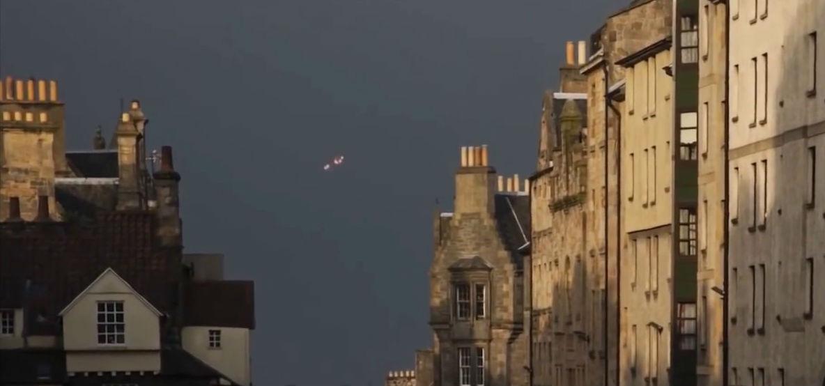 Прогуливаясь по знаменитой улице шотландского города Эдинбург, случайный прохожий стал свидетелем визита НЛО. Счастливчику даже удалось снять на камеру необычные "космические корабли".