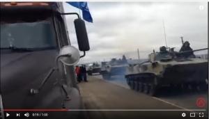 На трассе, попавшей в кадр, при этом движение не прекращается, по обе стороны стоят большегрузые фуры, хозяева которых принимают участие в протесте. Как видно по кадрам, для запугивания и разгона несогласных, направлено более 10 единиц военной техники.