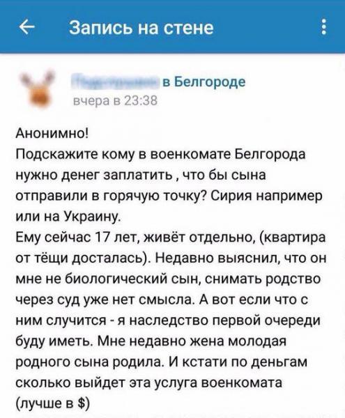В одном из российских пабликов появился пост от человека, который хотел бы отправить своего 17-летнего сына в горячую точку, чтобы он там погиб, а автор поста получил наследство.