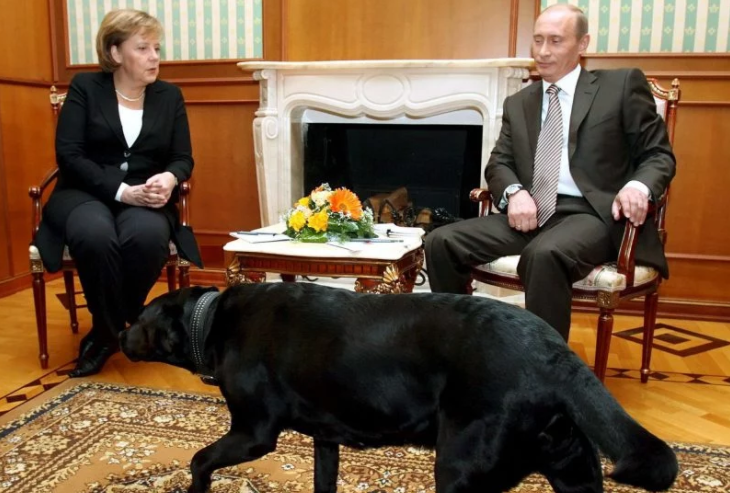 Автор статьи сделал отсылку к событию десятилетней давности, когда во время встречи Путина с канцлером Германии Ангелой Меркель в помещение завели собаку лидера Кремля, хотя тот прекрасно знал, что Меркель боится собак.
