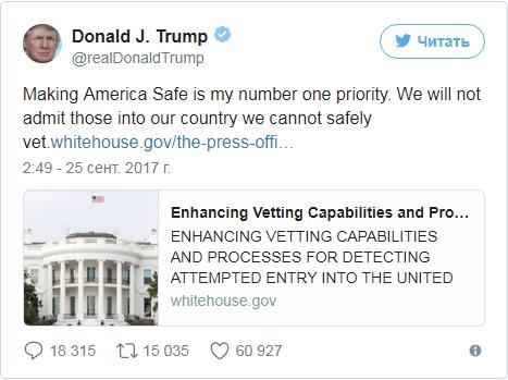 Американский лидер написал, что обеспечение безопасности государства является для него приоритетом. Подписанный документ вступит в силу 18 октября текущего года. В указе говорится, что гражданам этих стран заморожен въезд по иммиграционным и неиммиграционным визам. Что касается Венесуэллы, то запрет распространяется только на чиновников.