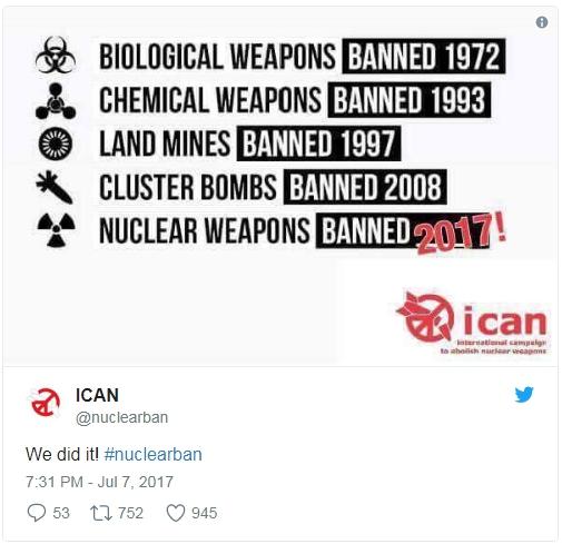 Неправительственные организации (почти 100 стран), входящие в состав кампании ICAN, выступают за отказ от ядерного оружия и привлекают внимание всего мира к каким катастрофическим последствиям могут привести ядерные снаряды и бомбы.