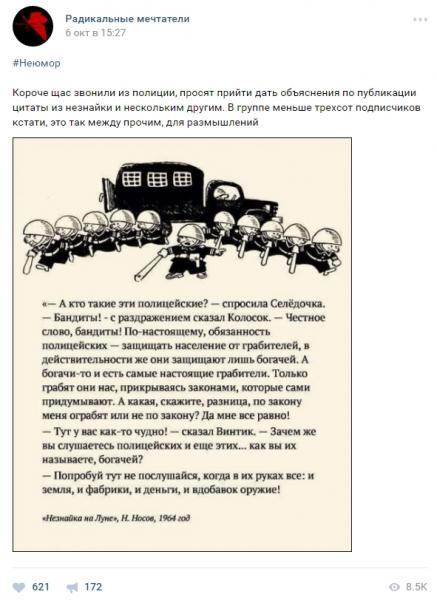 "Звонили из полиции, просят прийти дать объяснения по публикации цитаты из Незнайки и нескольким другим. В группе меньше трехсот подписчиков кстати, это так между прочим, для размышлений", - говорится на странице группы.