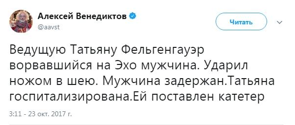 В здание радиостанции «Эхо Москвы» ворвался неизвестный мужчина. Он ослепил газовым баллончиком охранника и ударил ножом в горло ведущую и заместителя главреда Татьяну Фельгенгауэр. Женщину увезли в больницу на скорой, а нападавшего задержали и передали полиции.