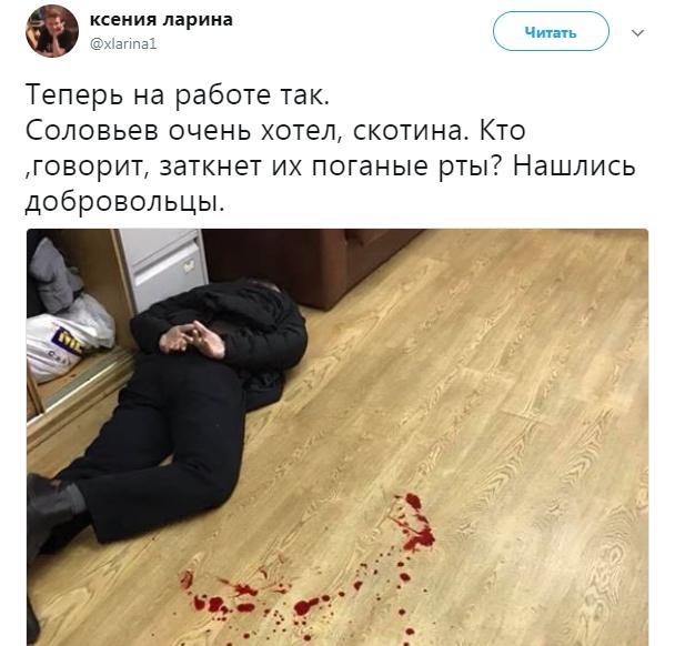 Российская журналистка Ксения Ларина после нападения на свою коллегу Татьяну Фельгенгауэр опубликовала в своем твиттере пост, в котором обвинила кремлевского пропагандиста Соловьева, заявив, что он "этого хотел".