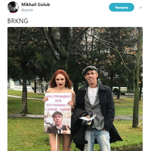 В сети появилось фото, на котором обнаженная девица прикрывается плакатом с надписью: "Наш президент 2018. Без паники! С нами - Панин". Рядом с девушкой стоит сам Панин в рваных джинсах.