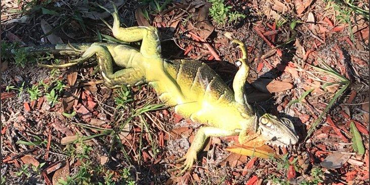 Жители штата находят на земле много окоченевших игуан. Дело в том, что хладнокровные рептилии при снижении температуры до +10 градусов и менее цепенеют и падают с деревьев.