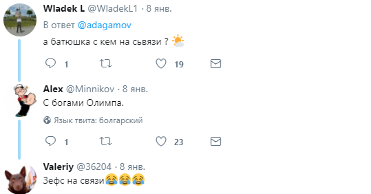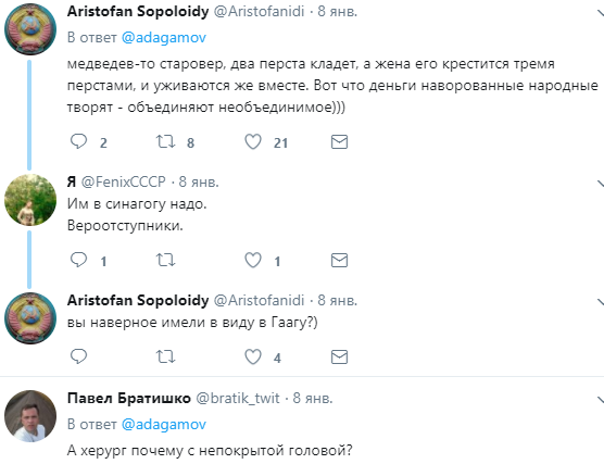 В комментариях предложили запретить Медведеву посещать такие мероприятия, потому что почти каждый раз интернет «взрывается» от обилия смешных фотографий. Также пользователи предположили, что батюшка-ФСБшник при помощи наушника поддерживает связь с богами Олимпа, а уживаться разноверцам супругам Медведевым помогают наворованные деньги.