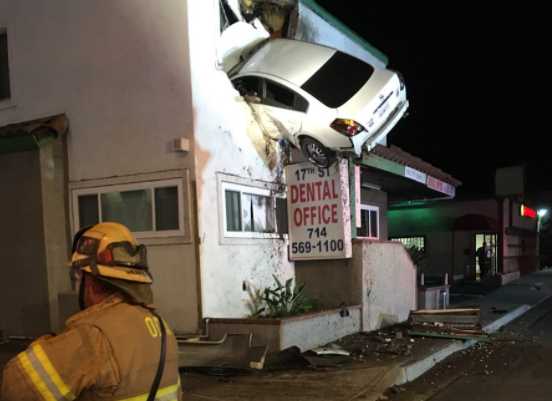 В городе Санта-Ана, округ Орандж штата Калифорния, водитель легкового автомобиля под действием наркотиков попал в аварию. Машина застряла на втором этаже офисного здания.