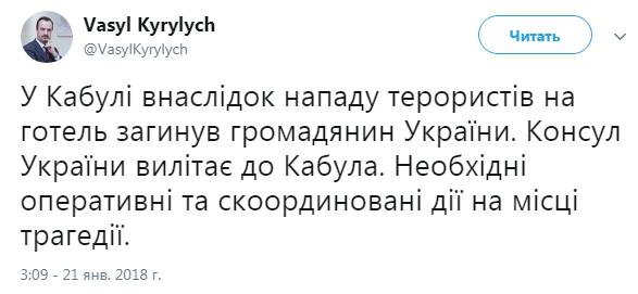 «Консул Украины вылетает в Кабул. Необходимы оперативные и скоординированные действия на месте трагедии", - написал Кирилич в соцсети.