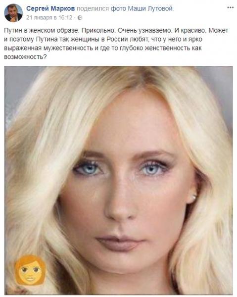 Российский пропагандист Сергей Марков сделал сомнительный комплимент президенту РФ Владимиру Путину. На своей странице в Фейсбуке он опубликовал отфотошопленный снимок хозяина Кремля и восхитился его «глубинной женственностью».