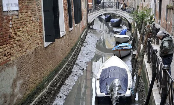 В итальянской Венеции из-за холодной погоды и низких приливов стремительно высыхают каналы. Местами вода опустилась до полутора метров, местами каналы обмелели полностью. Гондольерам пришлось приостановить свою работу и поставить лодки на прикол.