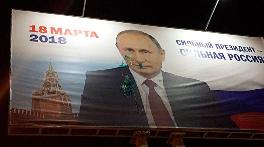 В России баннеры с изображением действующего лидера страны и кандидата в президенты Владимира Путина залили зеленой краской. Билборды были испорчены в городе Курган.
