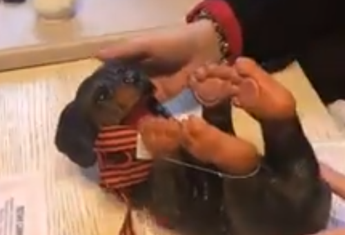 Невзоров показал статуэтку в виде собачки, лежащей на спине с поднятыми лапами. На шее у нее красуется георгиевская лента.