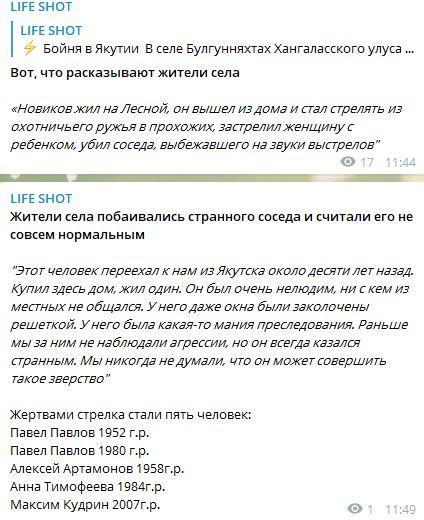 В сообщении говориться, что местный житель села Буллгунняхтаха неожиданно взял охотничье ружье и начал стрелять на поражение в соседей. Он убил 5 человек, включая 11-летнего мальчика, после чего застрелился.