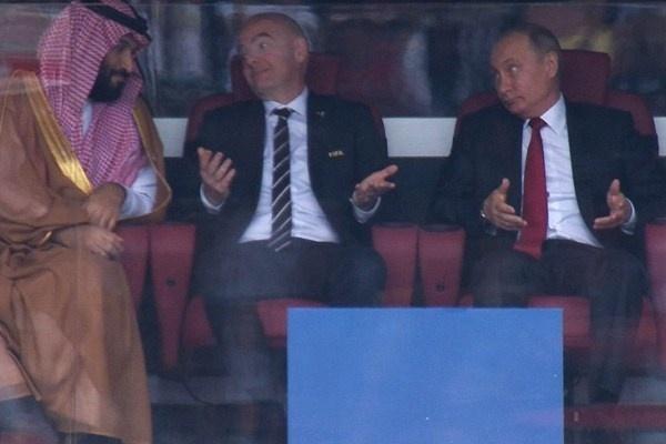 Во время каждого гола Путин разводил руками и улыбался. Пользователи соцсетей предположили, что глава Кремля извинялся за игру своей команды перед аравийским принцем Мухаммедом бен Сальман Аль Саудом.