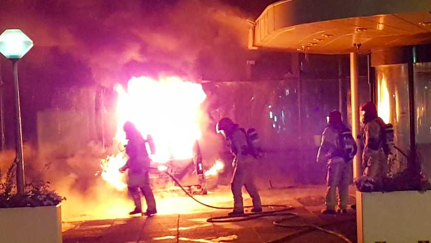 Белый Volkswagen Caddy на высокой скорости влетел в фасад из стекла, после удара авто загорелось. Прибывшие на место инцидента пожарные погасили пламя, высота которого достигала 14 метров.