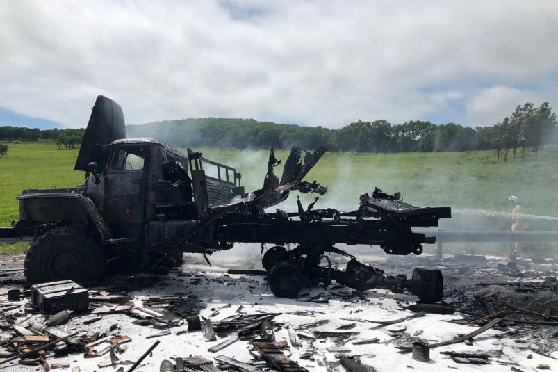 В Приморском крае РФ на трассе Уссурийск-Пограничный загорелся грузовик "Урал", груженый боеприпасами. Из-за происшествия пришлось эвакуировать жителей ближайших домов.