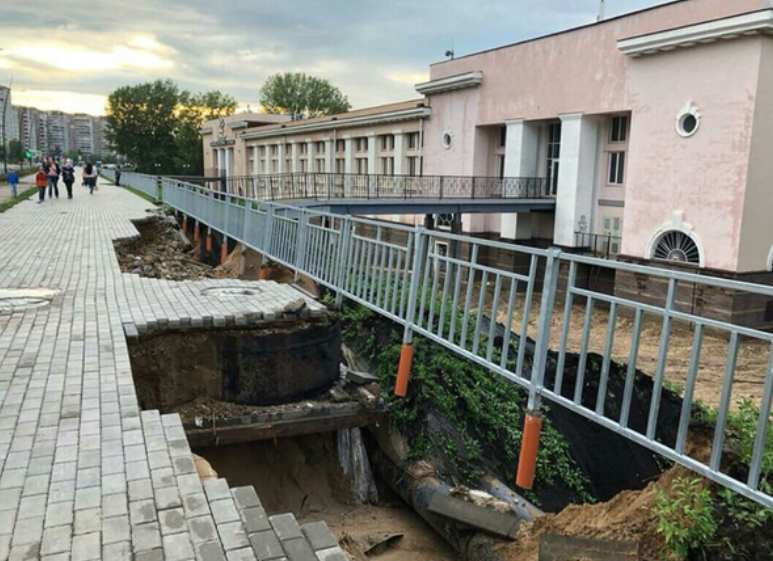 Грандиозный скандал разразился в социальных сетях, очевидцы опубликовали фотографии разрушенной ливнем дороги в Нижнем Новгороде Россия, передает Час Пик.