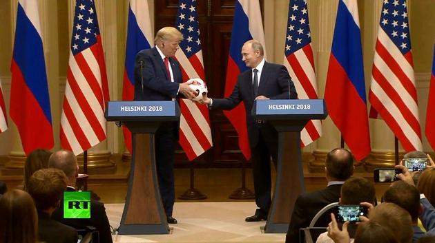 Во время пресс-конференции по итогам встречи в Хельсинки, российский президент Владимир Путин cделал подарок лидеру США Дональду Трампу. Он вручил ему мяч с ЧМ-2018 по футболу, который завершился в РФ.
