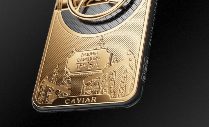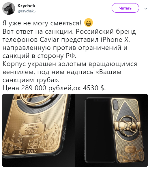 "Я уже не могу смеяться! Вот ответ на санкции. Российский бренд телефонов Caviar представил iPhone X, направленную против ограничений и санкций в сторону РФ. Корпус украшен золотым вращающимся вентилем, под ним надпись «Вашим санкциям труба». Цена 289 000 рублей, около 4530 долларов", - написал в Твиттере пользователь Krychek.