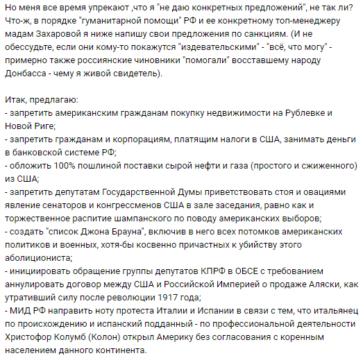 На своей странице в соцсети Гиркин прокомментировал слова спикера МИД РФ Марии Захаровой о том, что Россия будет вынуждена "зеркально ответить" на санкции США.