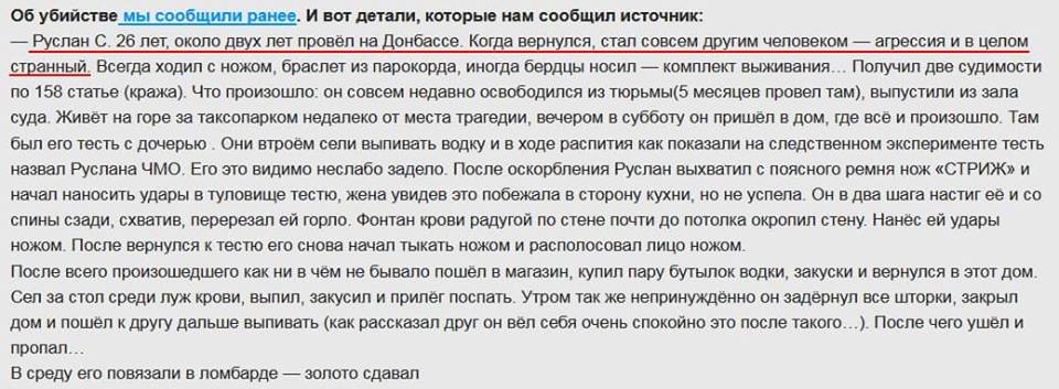 Во время распития алкоголя вместе с женой и тестем последний обозвал Руслана "чмо", после чего экс-боевик схватил нож и начал наносить удары в туловище мужчины. Жена пыталась убежать на кухню, но не успела: Руслан перерезал ей горло, после чего вернулся к телу тестя и продолжил полосовать его ножом.