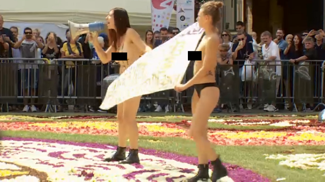 Очередная обнаженная акция участниц "Femen" всколыхнула столицу Бельгии Брюссель. Во время фестиваля «Ковер из цветов» две автивистки протестовали против помещения многодетной матери из Сербии и четверых ее детей в закрытый центр для мигрантов.