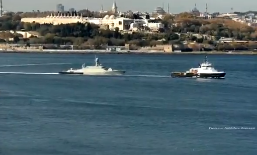 Пользователь Твиттера "Фосфорная Горловка" выложил видео, как российский корабль тащат на буксире через Босфор.