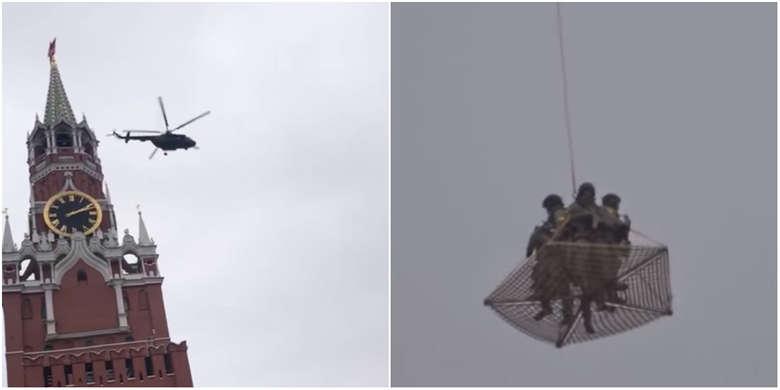 Газета "Ведомости" обратила внимание на видео, которое были сделано со значительным приближением. Пользователь, который опубликовал их на своем канале в YouTube, затем его удалил. На видео видно, что вертолет несет своего рода корзину, в которой находятся люди в военных костюмах и с оружием.