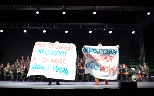 Посреди концерта активисты, поддерживающие Украину, Михал Войцещчук и Рафал Сушек выбежали на сцену с транспарантами и начали скандировать "Лапы прочь от Украины!".