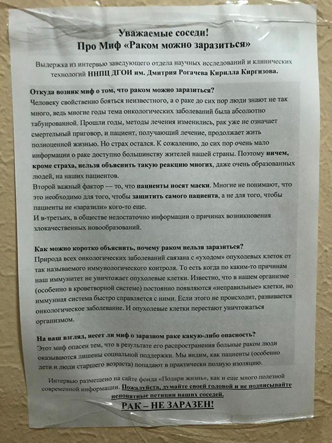 Некоторые жильцы пытаются вразумить "активистов" и расклеивают в подъезде листовки о том, что рак не заразен.