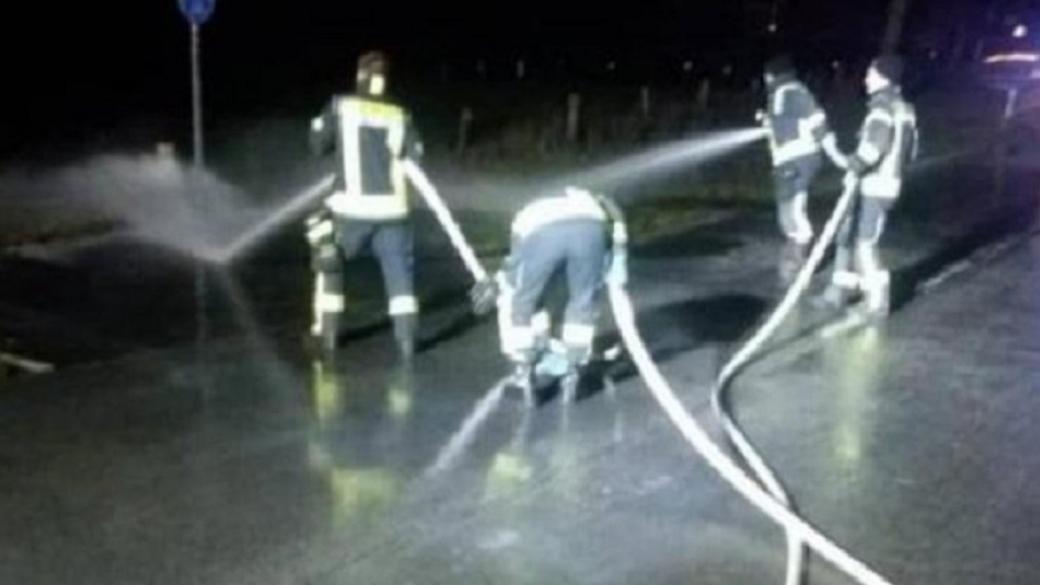20 сотрудников чрезвычайных служб очистили дорогу с помощью горячей воды и соли. Полиция оценила ущерб в 10 тысяч евро. Ведется расследование.