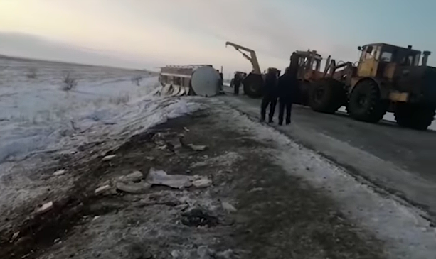 В Казахстане неподалеку от границы с Россией опрокинулась автоцистерна со спиртом. Местные жители поспешили к месту аварии с ведрами и бидонами.