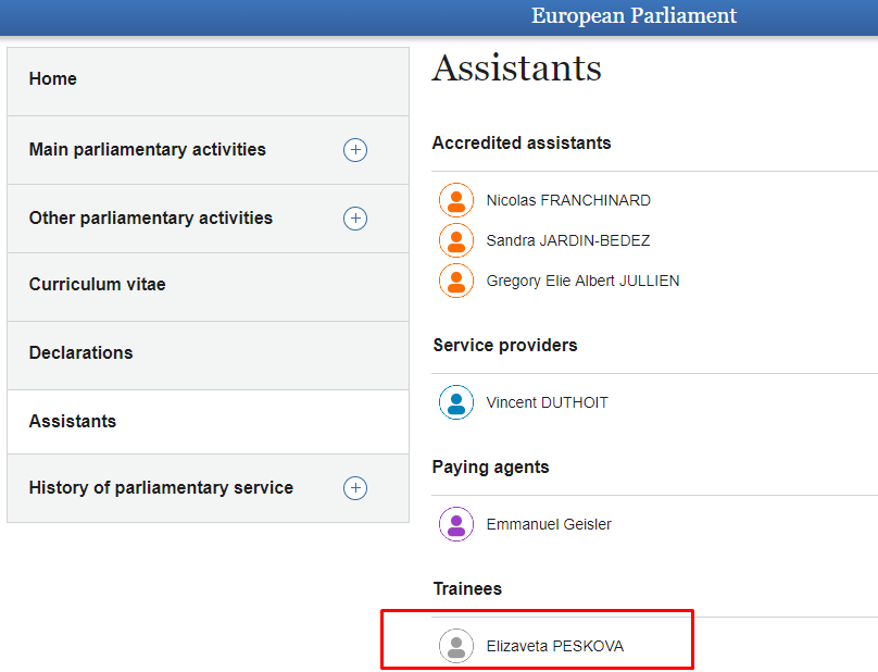 Информация о том, что Пескова действительно стажируется в Европарламенте, указана на официальном сайте органа.