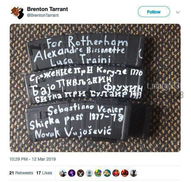 Накануне теракта Таррант выложил в Твиттере манифест, в котором содержались неонацистские тезисы. Также он опубликовал фото рожков автомата, на которых были написаны "ключевые моменты становления европейской цивилизации".