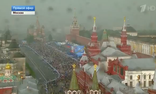 Акция "Бессмерный полк" состоялась, но ее участники скрывались под зонтами и непромокаемыми плащами, пока дождь с градом шел стеной. Соответствующие кадры попали в прямую трансляцию росТВ.