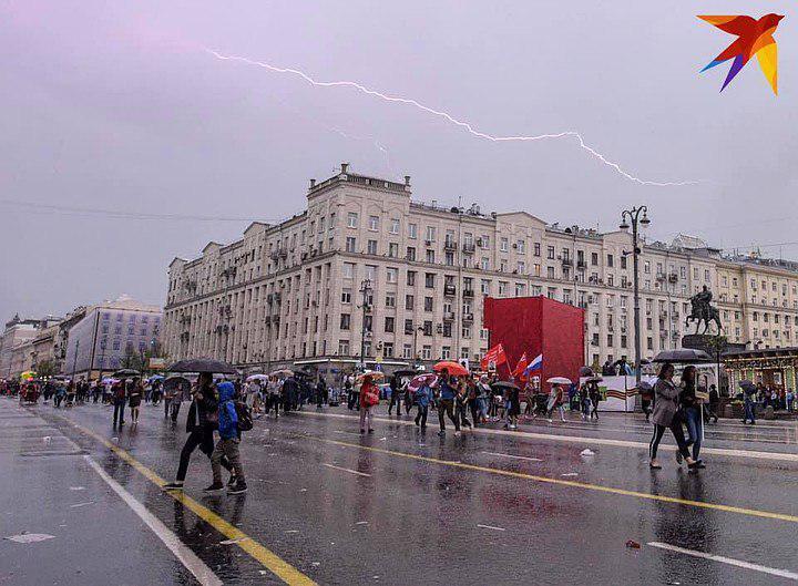 9 мая в Москву пришел грозовой фронт, из-за которого пришлось отменить воздушную часть военного парада, передает Час Пик.