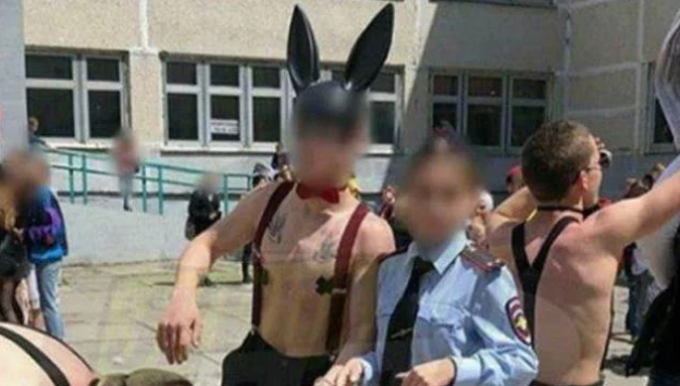 К "празднику" выпускники надели соответствующую атрибутику: парни пришли в масках зайцев, шортах с подтяжками на голое тело и с заклеенными черным скотчем сосками. Одна девушка была одета в полицейскую форму.