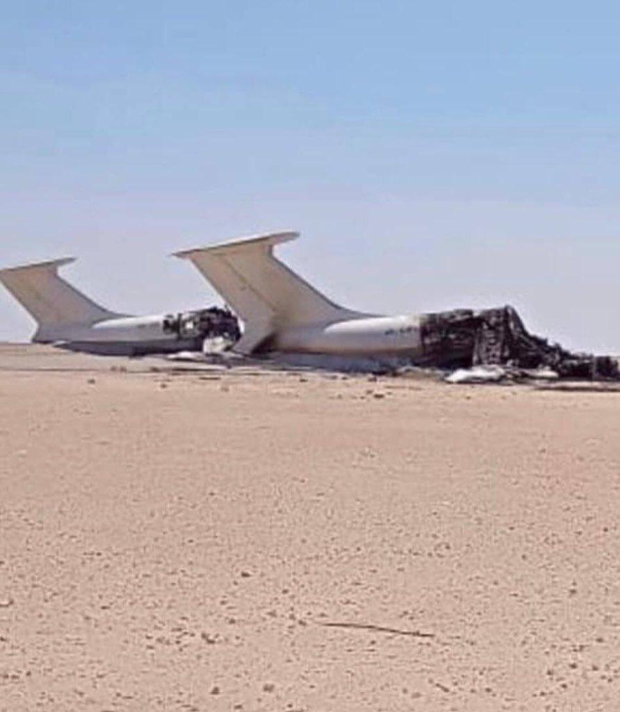Photo sirculated on #Libya FB, reportedly shows 2 destroyed cargo aircrafts in al-Jufra airbase. pic.twitter.com/Wz1WcOv4ZQ