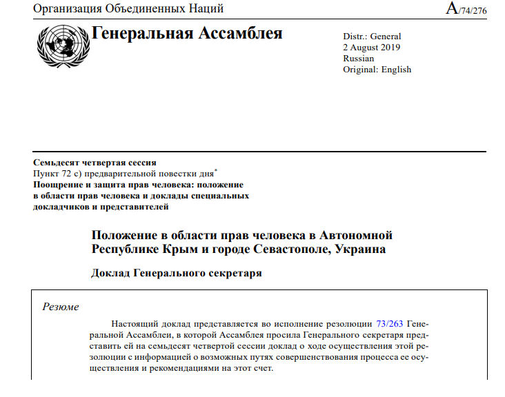 Организация объединенных наций опубликовала первый доклад генерального секретаря Антониу Ґутерриша о нарушении прав человека в аннексирована Крыму.